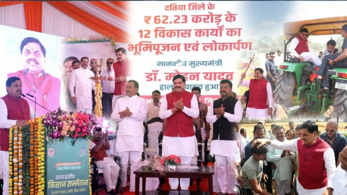 दतिया। मध्यप्रदेश के मुख्यमंत्री डॉ. मोहन यादव ने 24 मार्च को दतिया जिले के भांडेर के लिए खुशियों का पिटारा खोल दिया। उन्होंने यहां 62 करोड़ 23 लाख रुपये की लागत के 12 विकास कार्यों का भूमि-पूजन और लोकार्पण किया। उन्होंने शासन की जन-कल्याणकारी योजनाओं का हितलाभ भी वितरित किया। मुख्यमंत्री डॉ. मोहन यादव ने यहां कृषि उपकरणों की प्रदर्शनी का अवलोकन भी किया। मौका था यहां आयोजित राज्य स्तरीय किसान सम्मेलन का।