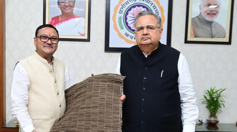 रायपुर। विधानसभा अध्यक्ष डॉ. रमन सिंह से मनोहर गौशाला के ट्रस्टी डॉ. अखिल जैन ने मुलाकात की। इस दौरान उन्हाेंने विधानसभा अध्यक्ष को गोबर से बनी चटाई भेंट की।