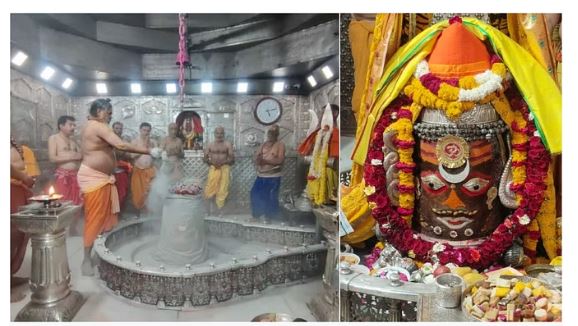 उज्जैन ।    विश्व प्रसिद्ध श्री महाकालेश्वर मंदिर में आज चैत्र कृष्ण पक्ष की एकादशी तिथि पर शुक्रवार तड़के भस्म आरती के दौरान चार बजे मंदिर के पट खुलते ही पंडे पुजारी ने गर्भगृह में स्थापित भगवान की प्रतिमाओं का पूजन किया। भगवान महाकाल का जलाभिषेक दूध, दही, घी, शक्कर और फलों के रस से बने पंचामृत से कर पूजन अर्चन किया गया। प्रथम घंटाल बजाकर हरि ओम का जल अर्पित किया गया। कपूर आरती के बाद बाबा महाकाल को चांदी का मुकुट और रुद्राक्ष व पुष्पों की माला धारण करवाई गई।