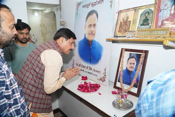 मुख्यमंत्री डॉ. मोहन यादव ने स्व. जैन को श्रद्धांजलि दी March 20, 2025 Khabar Bharti 24 मुख्यमंत्री डॉ. मोहन यादव ने बुधवार को उज्जैन में श्री सपन जैन के निवास वीडी मार्केट पहुंचकर उनके पिता स्व. संजय कुमार जैन के चित्र पर पुष्प अर्पित कर श्रद्धांजलि दी। उन्होंने शोक संतप्त परिजन से भेंटकर ढांढस बंधाया और शोक संवेदनाएं व्यक्त की। Spread the love