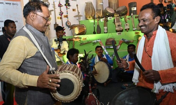 भिलाई। प्रख्यात लोकवाद्य संग्राहक रिखी क्षत्रिय ने छत्तीसगढ़ राज्योत्सव में जनसंपर्क विभाग छत्तीसगढ़ शासन के पैवेलियन पर शानदार माहौल बना दिया। रिखी और उनके समूह की प्रस्तुति की मुख्यमंत्री विष्णुदेव साय ने खुल कर तारीफ की। इस दौरान जब रिखी क्षत्रिय ने लोहाटी बाजा के साथ सरगुजिहा करमा की धुन छेड़ी तो मुख्यमंत्री साय भी खुद को रोक न सके। श्री साय ने मांदर पर थाप देते हुए करमा नृत्य किया। जिस पर रिखी और उनके साथियों ने भी जमकर नृत्य प्रदर्शन किया।