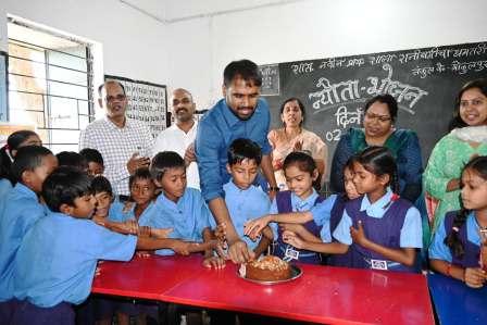 धमतरी। कलेक्टर अबिनाश मिश्रा ने आज अपना जन्मदिन धमतरी शहर के गोकुलपुर स्थित नवीन प्राथमिक स्कूल रानीबगीचा के बच्चां के साथ मनाया। इस मौके पर कलेक्टर मिश्रा ने स्कूली बच्चों के साथ केक काटा और उन्हें न्यौता भोज भी कराया। कलेक्टर मिश्रा ने स्वयं अपने हाथों से नन्हें-मुन्ने बच्चों को भोजन परोसा।