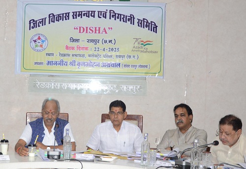 रायपुर। सांसद बृजमोहन अग्रवाल की अध्यक्षता में आज कलेक्टोरेट परिसर स्थित रेडक्रास सभाकक्ष में जिला विकास समन्वय एवं निगरानी समिति (दिशा) की बैठक हुई। बैठक में खेल एवं युवा कल्याण मंत्री टंकराम वर्मा, रायपुर महापौर मीनल चौबे, विधायक सुनील सोनी, विधायक राजेश मूणत, विधायक पुरंदर मिश्रा, विधायक मोतीलाल साहू, विधायक इंद्र कुमार साहू, विधायक अनुज शर्मा, विधायक गुरू खुशवंत साहेब, रायपुर संभागायुक्त महादेव कावरे, कलेक्टर डॉ. गौरव कुमार सिंह, एसएसपी डॉ. लाल उम्मेद सिंह, रायपुर नगर निगर आयुक्त विश्वदीप, जिला पंचायत सीईओ कुमार बिश्वरंजन उपस्थित रहे।