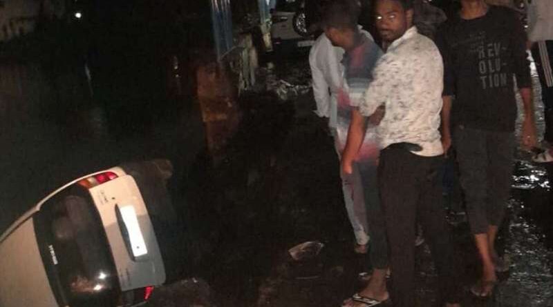 खराब रोड के कारण सड़क से फिसल कर तालाब में उतरी कार