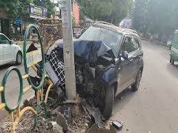 तेज रफ्तार स्कार्पियों मोड़ पर बिजली पोल से टक्कराई,गेट तोड़कर घायल युवकों को निकाला