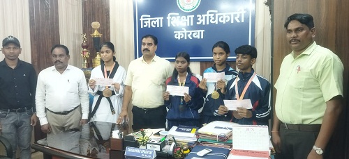 कोरबा। राष्ट्रीय शालेय क्रीड़ा प्रतियोगिता में कोरबा जिले के पदक प्राप्त राष्ट्रीय खिलाड़ीयों को आज जिला प्रशासन के निर्देशानुसार तामेश्वर उपाध्याय जी जिला शिक्षा अधिकारी कोरबा ने तुलसी मानिकपुर पिता स्व नयनदास मानिकपुरी नेटबाल बालिका 19वर्ष शा उमावि विद्या. पी डब्ल्यू डी रामपुर कोरबा ने 67वीं राष्ट्रीय खेल रेवारी हरियाणा में तृतीय स्थान प्राप्त कर ब्रांज मेंडल, कु झिलमिल ठाकुर पिता स्व राजेन्द्र सिंह ठाकुर शा पू मां शा पी डब्ल्यू डी रामपुर कोरबा ने नेटबाल बालिका 14वर्ष 68वीं राष्ट्रीय खेल कोरबा छत्तीसगढ़ में गोल्ड मेडल प्राप्त किया तथा कु . पूर्वी कंवर पिता राम लखन कंवर ब्रिलियंट पब्लिक स्कूल कोरबा ने ताइक्वांडो बालिका 14वर्ष में 68वीं राष्ट्रीय खेल विदिशा मध्य प्रदेश से प्रथम स्थान प्राप्त कर गोल्ड मेडल प्राप्त किया एवं वेदांत कश्यप पिता नरेश कश्यप डीपीएस बालको नगर ने ताइक्वांडो 14वर्ष बालक वर्ग में 68 वीं राष्ट्रीय शालेय खेल प्रतियोगिता विदिशा मध्य प्रदेश से तृतीय स्थान ब्रांज मेंडल प्राप्त किया। जिन्हें छत्तीसगढ़ शासन के आदेशानुसार लोक शिक्षण संचालनालय नवा रायपुर के द्वारा कु तुलसी मानिकपुरी को 10000 , कु. झिलमिल ठाकुर को 21000 , पूर्वी कंवर 21000 , वेदांत कश्यप को 10000 का बैंक ड्राफ्ट जिला शिक्षा अधिकारी कोरबा के द्वारा प्रदान किया। श्री उपाध्याय ने कहा इस प्रकार से खेलो में भाग लेकर जिला एवं राज्य का नाम रोशन करते रहे।
