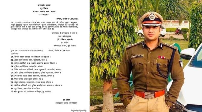 भोपाल | 01 अप्रैल 2025 | मध्यप्रदेश शासन ने प्रशासनिक फेरबदल करते हुए छिंदवाड़ा रेंज के उप पुलिस महानिरीक्षक (DIG) सचिन कुमार अतुलकर (IPS 2007) को पुलिस महानिरीक्षक (IG), जबलपुर जोन का अतिरिक्त प्रभार सौंपा है। गृह विभाग द्वारा जारी आदेश के अनुसार, यह जिम्मेदारी अस्थायी रूप से आगामी आदेश तक प्रभावी रहेगी।