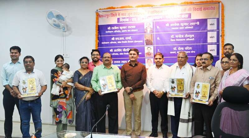 बिलासपुर । शासन के विभिन्न विभागों में पदस्थ वरिष्ठ अधिकारियों की सेवानिवृत्ति पर आज जिला कार्यालय में आयोजित कार्यक्रम में उन्हें सामूहिक रूप से भावभीनी बिदाई दी गई। कार्यक्रम में अधिकारियों के परिवारजन भी  शामिल हुए। इन अधिकारियों में जल संसाधन विभाग के कार्यपालन अभियंता सतीश सराफ, पीडब्ल्यूडी ई.एन.एम के कार्यपालन अभियंता एच.एल.शर्मा, पीडब्ल्यूडी संभाग क्रमांक 02 के कार्यपालन अभियंता अरविंद चौरसिया, आरईएस के कार्यपालन अभियंता समय लाल कैवर्त, जिला टीकाकरण अधिकारी मनोज सैमुअल, सहायक खाद्य अधिकारी अशोक सवन्नी एवं श्रेत्रीय प्रशिक्षण केन्द्र की प्राचार्य डॉ. ईला चंदेल शामिल है। जिला प्रशासन की ओर से कलेक्टर अवनीश शरण ने सभी अधिकारियों को शॉल, श्रीफल एवं स्मृति चिन्ह देकर सम्मानित किया। कलेक्टर ने सभी के सेवाकाल का स्मरण करते हुए उनके स्वस्थ, सुखद एवं दीर्घायु जीवन के लिए शुभकामनाएं दी। सभी अधिकारियों ने अपने लंबी सेवाकाल के रोचक अनुभव साझा किए। इस अवसर पर जिला पंचायत सीईओ आरपी चौहान एवं सहायक कलेक्टर तन्मय खन्ना ने भी सभी के कार्य की सराहना करते हुए उन्हें सुखद भविष्य की शुभकामनाएं दी।