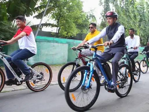 इंदौर नगर निगम कमिश्नर शिवम वर्मा अपने निवास से जीपीओ चौराहे तक साइकिल से पहुंचे।