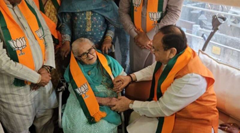भाजपा के स्थापना दिवस के मौके पर राष्ट्रीय अध्यक्ष जेपी नड्डा ने दिल्ली में पार्टी की वरिष्ठ कार्यकर्ता 98 वर्षीय शकुंतला आर्य से मुलाकात की