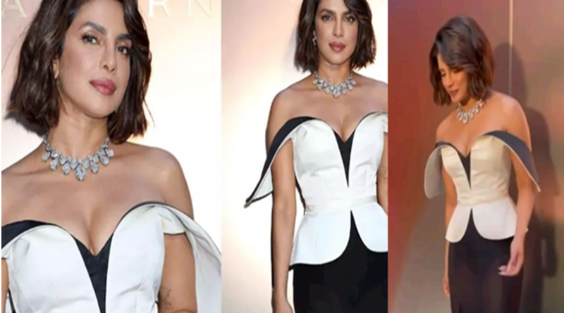 बुल्गारी इवेंट में देसी गर्ल पूरे विदेशी अवतार में नजर आईं। उन्होंने क्रीम और ब्लैक कलर का ऑफ-शोल्डर गाउन पहना था। इस आउटफिट के साथ उन्होंने सर्पेंटी एटर्ना नेकलेस के साथ अपने लुक को पूरा किया।