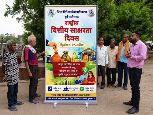 दुर्ग। राष्ट्रीय वित्तीय साक्षरता दिवस के अवसर पर जिला विधिक सेवा प्राधिकरण दुर्ग द्वारा एक व्यापक एवं प्रभावी वित्तीय साक्षरता जागरूकता शिविर का आयोजन 25 अप्रैल को किया गया। इस अवसर पर प्रधान जिला एवं सत्र न्यायाधीश/अध्यक्ष, जिला विधिक सेवा प्राधिकरण, दुर्ग के मार्गदर्शन में दुर्ग, भिलाई-3 एवं धमधा क्षेत्र के पैरालीगल वॉलंटियर्स ने उत्साहपूर्वक सहभागिता निभाई और समाज के विभिन्न वर्गों तक पहुँचकर वित्तीय साक्षरता एवं कानूनी अधिकारों के प्रति जागरूकता फैलाने का महत्वपूर्ण कार्य किया। शिविर के अंतर्गत पीएलवी टीमों ने गाँवों, शहरों एवं मोहल्लों में घर-घर जाकर महिलाओं, बच्चों, बुजुर्गों एवं युवाओं को साइबर फ्रॉड एवं साइबर क्राइम के बारे में विस्तार से जानकारी दी। साथ ही, आमजन को नि:शुल्क विधिक सहायता, नि:शुल्क अधिवक्ता की सुविधा तथा विभिन्न प्रकार की कानूनी सलाह के संबंध में जागरूक किया गया। लोगों को बताया गया कि आर्थिक रूप से कमजोर एवं जरूरतमंद व्यक्ति जिला विधिक सेवा प्राधिकरण के माध्यम से नि:शुल्क अधिवक्ता एवं कानूनी परामर्श प्राप्त कर सकते हैं।