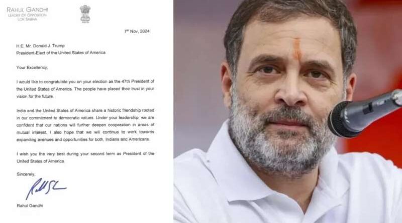 अपने लोकसभा में विपक्ष के नेता के लेटर पैड के जरिए दिए गए संदेश में राहुल ने ट्रंप के लिए लिखा, ‘मैं आपको अमेरिका के 47वें राष्ट्रपति के रूप में चुने जाने पर बधाई देना चाहता हूं. लोगों ने भविष्य के लिए आपके नजरिए पर अपना भरोसा जताया है.’ राहुल ने अपने संदेश में लिखा, ‘भारत और अमेरिका के बीच पुरानी दोस्ती रही है जो कि लोकतांत्रिक मूल्यों के लिए हमारी प्रतिबद्धता पर आधारित रही है.’