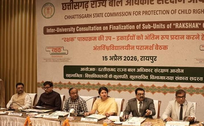 रायपुर,छत्तीसगढ़ राज्य बाल अधिकार संरक्षण आयोग द्वारा राज्य में “रक्षक (RAKSHAK) पाठ्यक्रम” को प्रभावी रूप से लागू करने की दिशा में महत्वपूर्ण पहल की जा रही है। इस विशेष शैक्षणिक कार्यक्रम का उद्देश्य महाविद्यालयीन विद्यार्थियों के माध्यम से बाल अधिकारों के प्रति जागरूकता बढ़ाना, बच्चों की सुरक्षा सुनिश्चित करना और समाज में बाल संरक्षण के प्रति संवेदनशीलता विकसित करना है। इस पाठ्यक्रम के क्रियान्वयन के लिए पूर्व में मुख्यमंत्री श्री विष्णुदेव साय, महिला एवं बाल विकास मंत्री श्रीमती लक्ष्मी रजवाड़े तथा उच्च शिक्षा मंत्री श्री टंक राम वर्मा के सहयोग से एमओयू संपन्न किया गया था। यह समझौता राज्य के उच्च शिक्षण संस्थानों में “रक्षक” पाठ्यक्रम लागू करने की दिशा में एक महत्वपूर्ण कदम साबित हुआ है। इसी क्रम में बुधवार को रायपुर स्थित होटल बेबिलोन में “रक्षक” पाठ्यक्रम के अंतर्गत तैयार उप-इकाइयों (सब-यूनिट्स) को अंतिम रूप देने हेतु विश्वविद्यालय स्तरीय परामर्श बैठक आयोजित की गई। कार्यक्रम की शुरुआत दीप प्रज्वलन से हुई, जिसके बाद आयोग के सचिव श्री प्रतीक खरे और डायरेक्टर श्रीमती संगीता बिंद ने अतिथियों का स्वागत किया। आयोग की अध्यक्ष डॉ. वर्णिका शर्मा ने अपने संबोधन में कहा कि “रक्षक पाठ्यक्रम केवल एक शैक्षणिक कार्यक्रम नहीं, बल्कि बच्चों के अधिकारों की सुरक्षा के लिए एक सशक्त सामाजिक अभियान है। हमारा प्रयास है कि इसे प्रभावी रूप से लागू कर आने वाली पीढ़ी को सुरक्षित और जागरूक बनाया जाए।” बैठक में राज्य के प्रमुख विश्वविद्यालयों—पंडित रविशंकर शुक्ल विश्वविद्यालय, कुशाभाऊ ठाकरे पत्रकारिता एवं जनसंचार विश्वविद्यालय, संत गहिरा गुरु विश्वविद्यालय (सरगुजा), श्री शंकराचार्य प्रोफेशनल यूनिवर्सिटी (भिलाई), एमिटी यूनिवर्सिटी और अंजनेय यूनिवर्सिटी—के कुलपति, कुलसचिव, प्रतिनिधि एवं विषय विशेषज्ञ शामिल हुए। परामर्श बैठक का मुख्य उद्देश्य पाठ्यक्रम की उप-इकाइयों पर विस्तृत चर्चा कर उन्हें अंतिम स्वरूप प्रदान करना था, ताकि आगामी शैक्षणिक सत्र से इसे प्रभावी रूप से लागू किया जा सके। इस दौरान विशेषज्ञों ने पाठ्यक्रम की संरचना, उपयोगिता और व्यवहारिक पहलुओं पर अपने सुझाव प्रस्तुत किए। सभी विश्वविद्यालयों के प्रतिनिधियों ने इस पहल को समय की आवश्यकता बताते हुए आयोग की सराहना की और इसके सफल क्रियान्वयन में पूर्ण सहयोग का आश्वासन दिया। आयोग को विश्वास है कि “रक्षक” पाठ्यक्रम जल्द ही राज्य के महाविद्यालयों में लागू होगा, जिससे विद्यार्थियों के माध्यम से बाल अधिकारों की सुरक्षा को मजबूती मिलेगी और बच्चों के सुरक्षित भविष्य के निर्माण में महत्वपूर्ण योगदान सुनिश्च