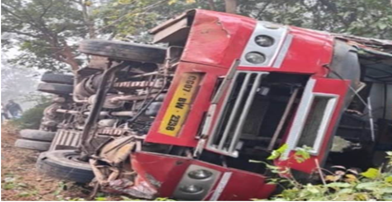 सड़क हादसा : तीर्थयात्रियों से भरी बस अनियंत्रित होकर पलटी, आठ को सामान्य चोट