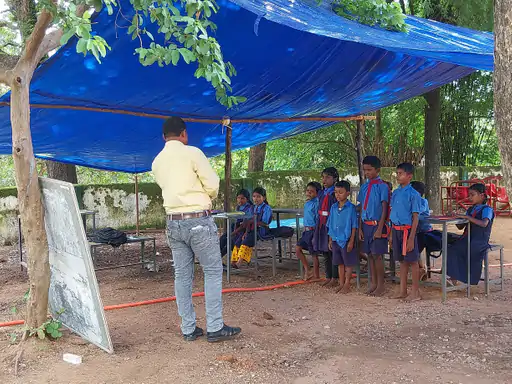 अंदरूनी गांव के इस प्राथमिक विद्यालय में एक ही चारदीवारी है, जिसके अंदर स्कूली सामान रखाता है, ऐसे एक कमरे में सभी कक्षाएं लगाना संभव नही है। बच्चो को खुले में पढ़ते देख पालकों ने पंचायत में विद्रोह कर दिया और मजबूरन पंचायत को सचिव को त्रिपाल खरीदकर सौपना पड़ा।
